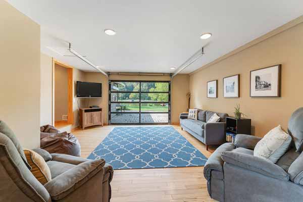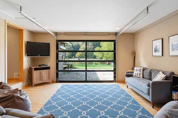 A unique garage door with windows serves to let the outside IN to the