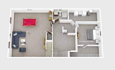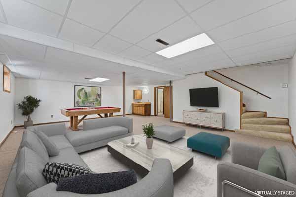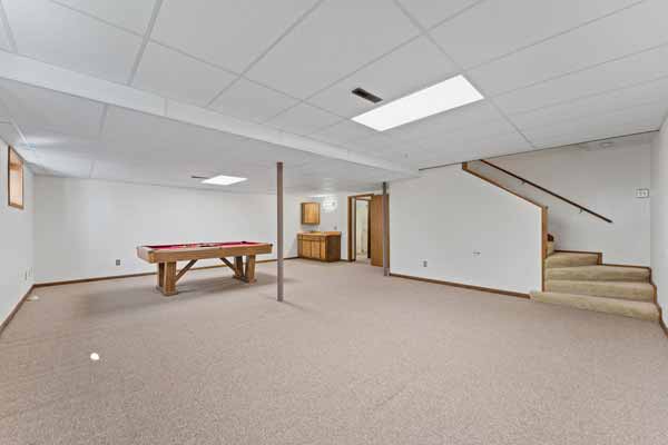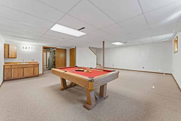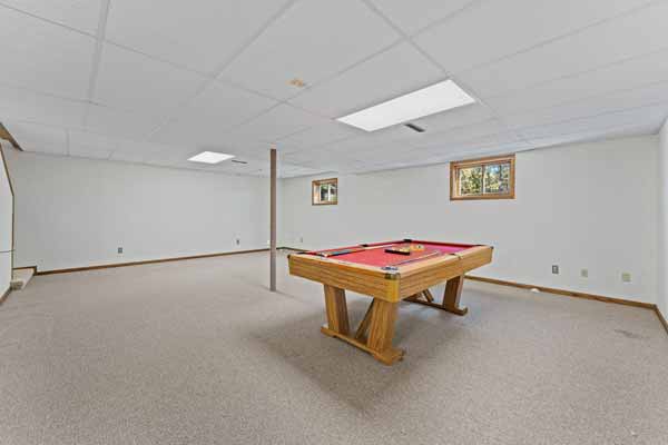 A super-sized recreation/living space in the lower level. Pool playing area