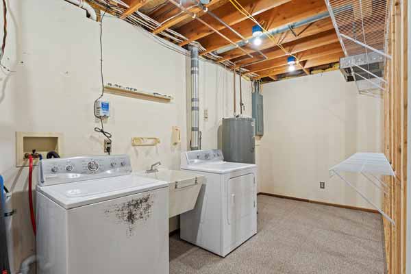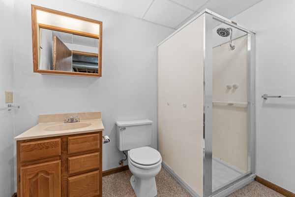 The lower level bath features a step in shower and a spacious laundry area