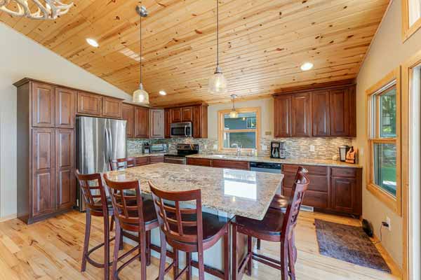 Upscale kitchen with Granite tops, a very large dining bar and stainless