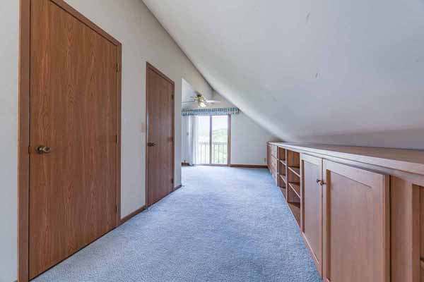 Two upper level bedrooms with a wide hallway between them. Shared walk-in closet